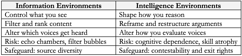 Information environments control what you encounter. They determine which articles appear in your feed and whose voices get amplified. Intelligence environments control how you process what you experience. They determine how you synthesize articles and which counterarguments you consider. Intelligence environments wield a distinctive power: they primarily alter your conclusions by shaping how you process observations, though they may also influence what information reaches you.