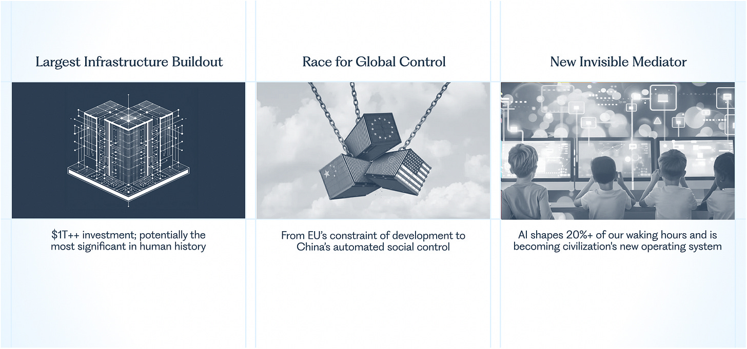 First, we face the largest infrastructure build in human history. Well over a trillion dollars in AI compute by the early 2030s. This transformation will reshape how humanity thinks and decides. It may eclipse the printing, industrial, and digital revolutions.