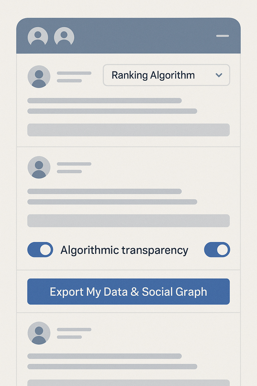 Locked exits: Can a user export identity, history, and social graph in one click and swap out the default recommender without rebuilding from scratch?
