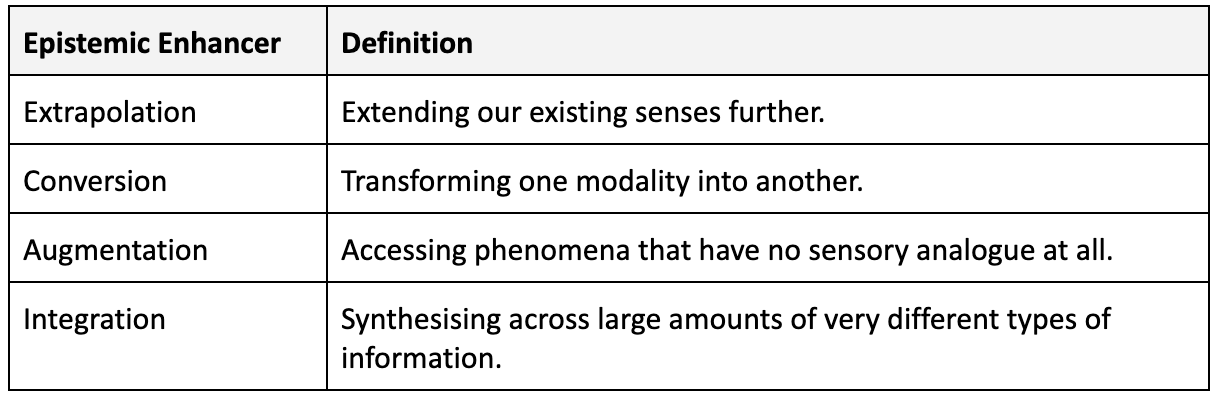 Scientific instruments provide extensions to humans’ senses. Telescopes and microscopes allowed us to see the far and the small. This type of enhancement is known as extrapolation. Another type of epistemic support is conversion, that is, transforming one modality into another (like sound into a visual image). Finally, we have those instruments that extend our capacities by giving access to phenomena that elude our senses, such as detecting radiation or magnetic fields. This is known as augmentation. These three moves – extrapolation, conversion, and augmentation – are all types of epistemic enhancers.