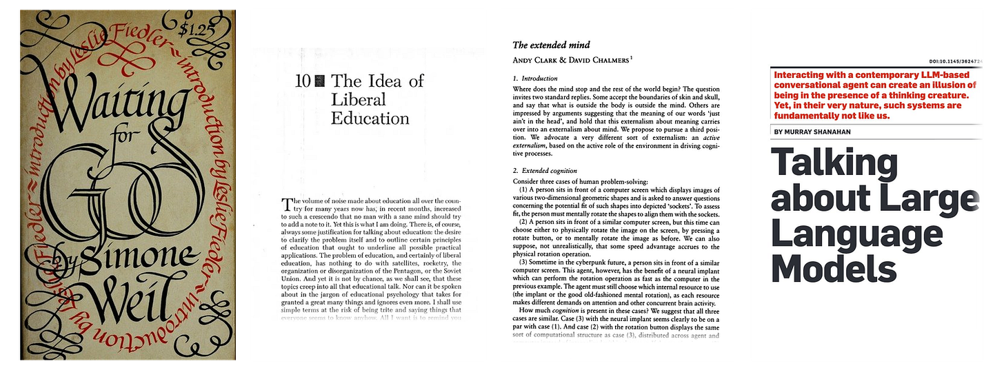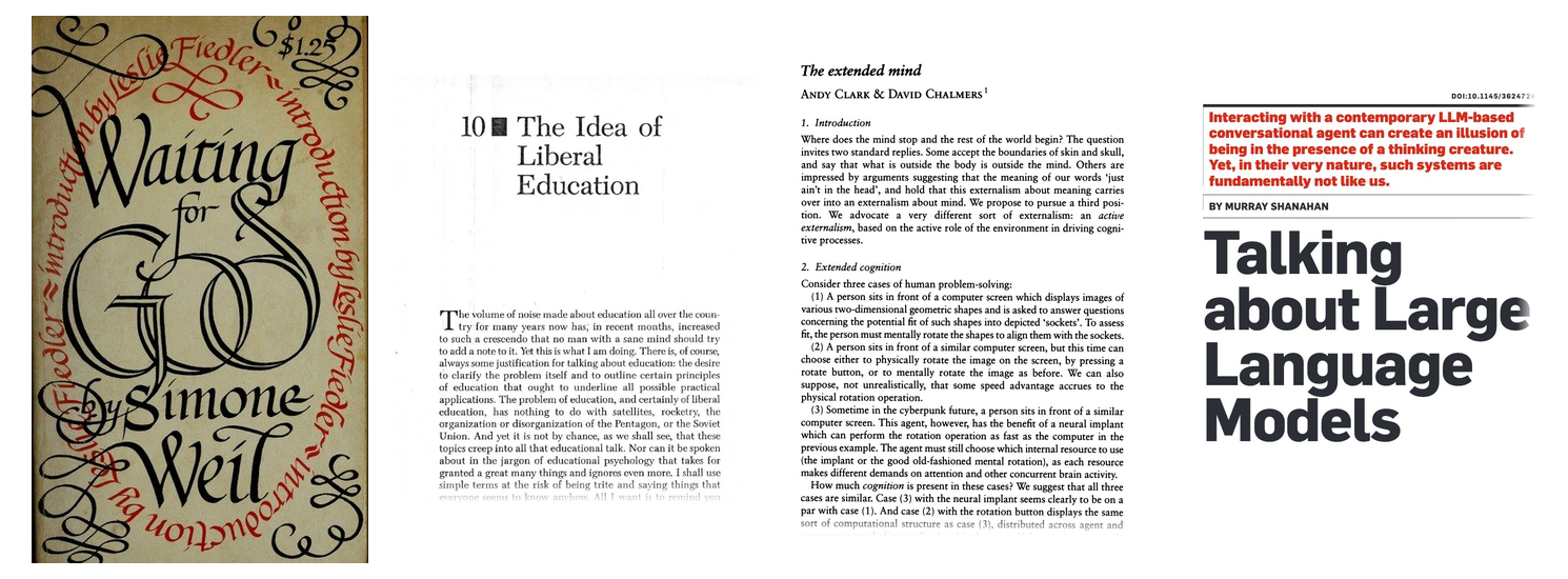 But what if the boundaries of the person aren’t where we think they are? Clark and Chalmers ask whether cognition is even confined to the skull. If the mind extends into the tools and environments we think with, what counts as “the student”? Shanahan complicates the picture further: LLMs create a compelling illusion of understanding, but they are fundamentally unlike us. If formation requires genuine encounter with other minds, what happens when the most available interlocutor is a machine?