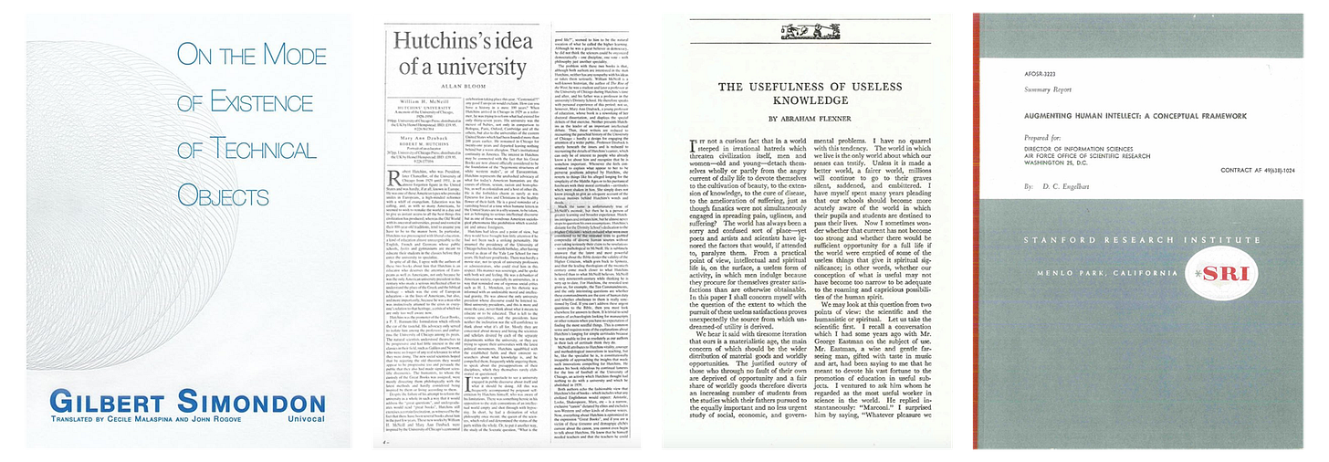 The final session focused on what comes next. Flexner’s defense of useless knowledge, written from the Institute for Advanced Study, is the purest case for protecting inquiry from the demand for application. Bloom’s portrait of Hutchins at UChicago shows what it looks like when someone actually tries to build an institution around these convictions, and the political will it requires. Simondon challenges the premise that technology and culture are opposed, arguing that the hostility between them is a sign of ignorance.