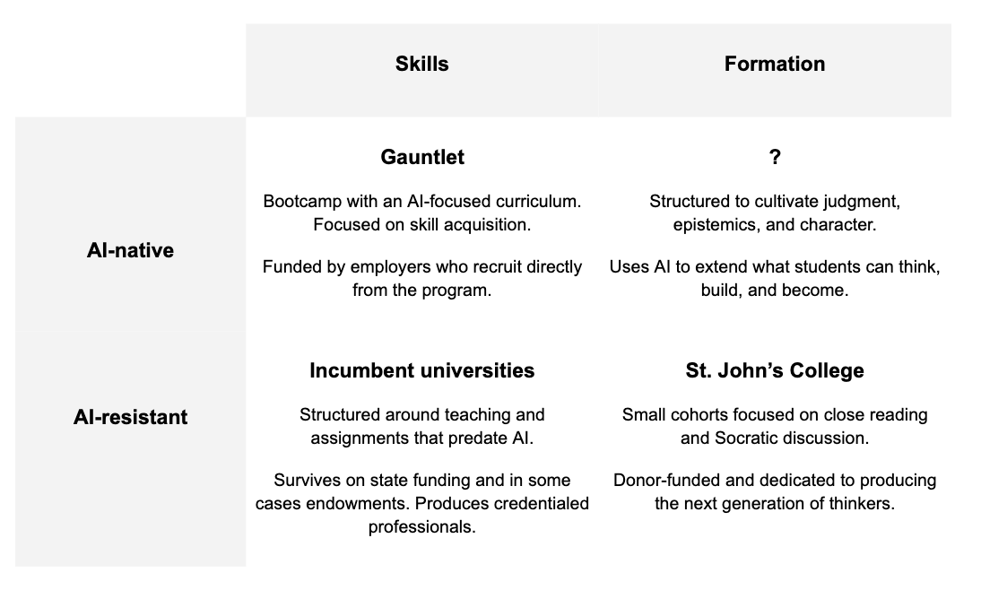 At the other, institutions like St. John’s College run intensive liberal arts programs built on sustained attention and close reading, with no AI in sight.